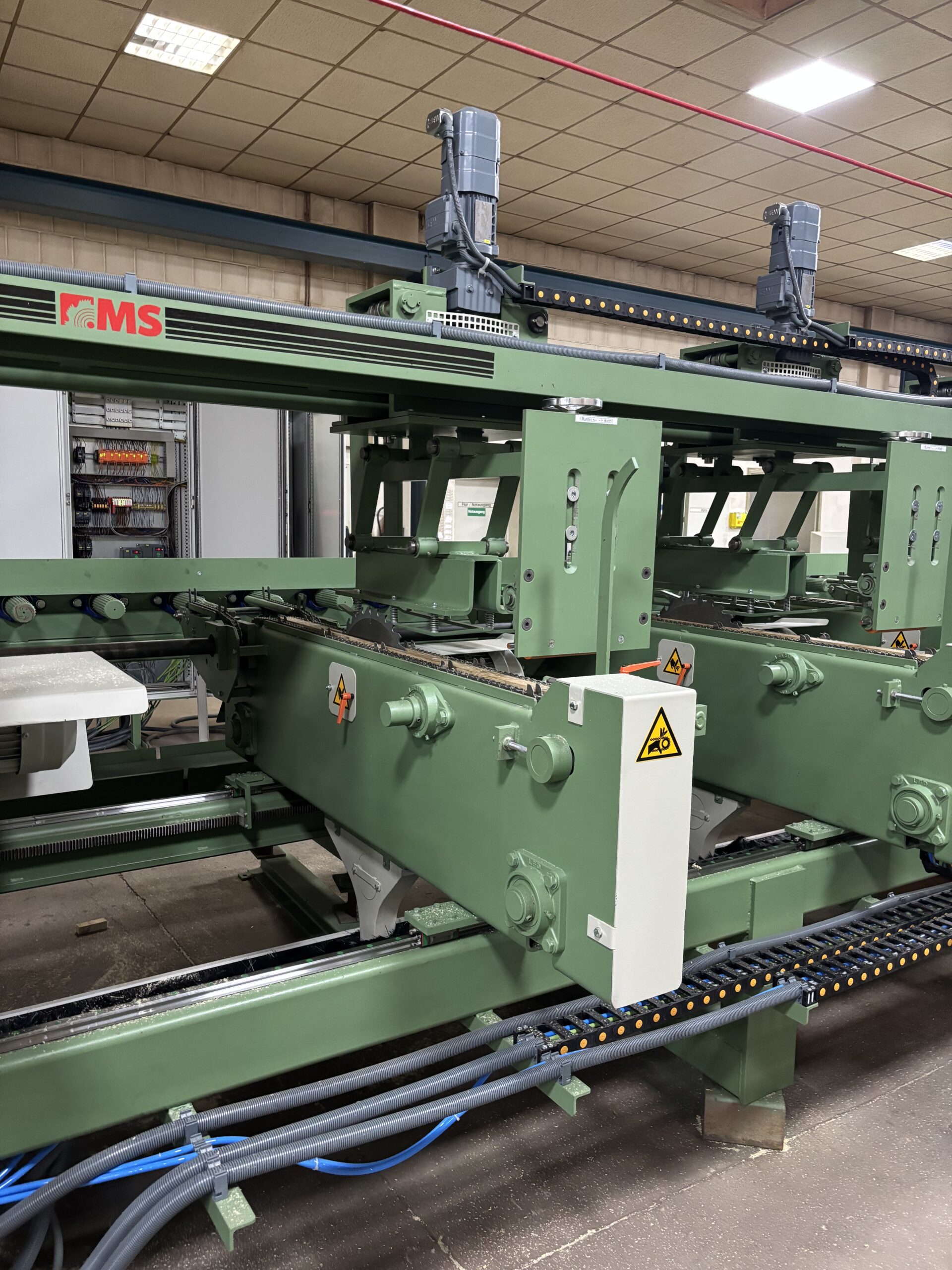 Система управления, разработанная нашим давним партнёром SEW, предоставляет широкие возможности настройки — как для каждого суппорта по отдельности, так и для их совместной работы, включая автоматическую компенсацию пропила. В общей сложности машина имеет 10 регулируемых осей, которые удобно настраиваются через операторскую панель.