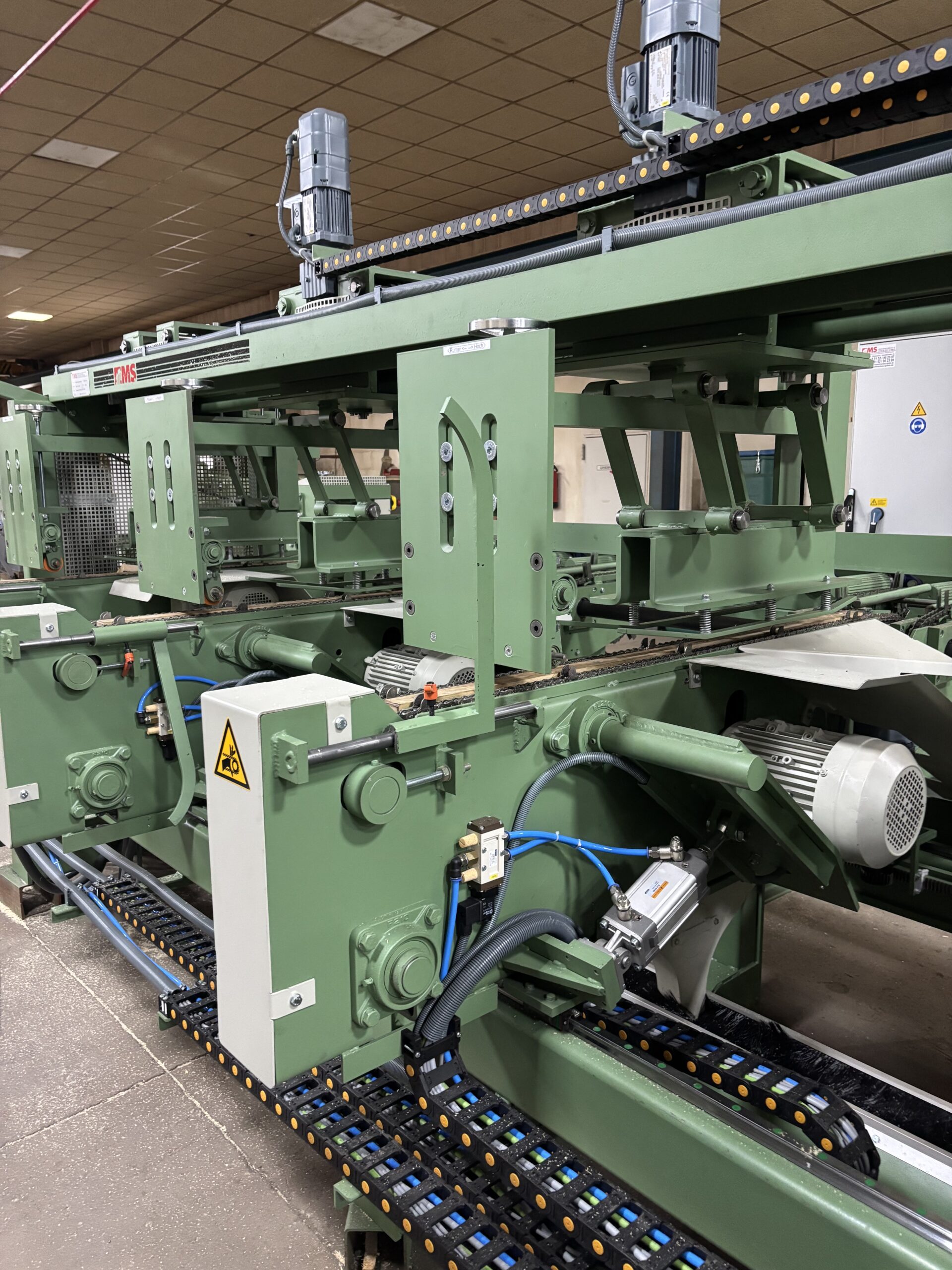 Доски автоматически подаются из магазина по одной, обрезаются по длине и затем с помощью транспортёра тактовой подачи — спроектированного и изготовленного нами — подаются в существующий строгальный станок. Весь процесс полностью автоматизирован и достигает скорости подачи до 80 м/мин.